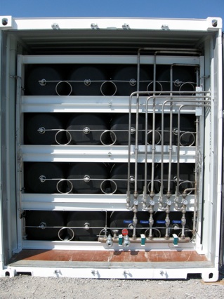 There are 2 primary module concepts. One is a smaller package, using either a 9 ft. or 10 ft. long cylinder, that is perfect for small users in hard-to-reach locations and/or difficult road conditions. The larger GTM is based on a standard 20 foot long ISO shipping container so that it can be easily moved and transported using equipment that is readily available anywhere in the world:Example One: The Small Module
